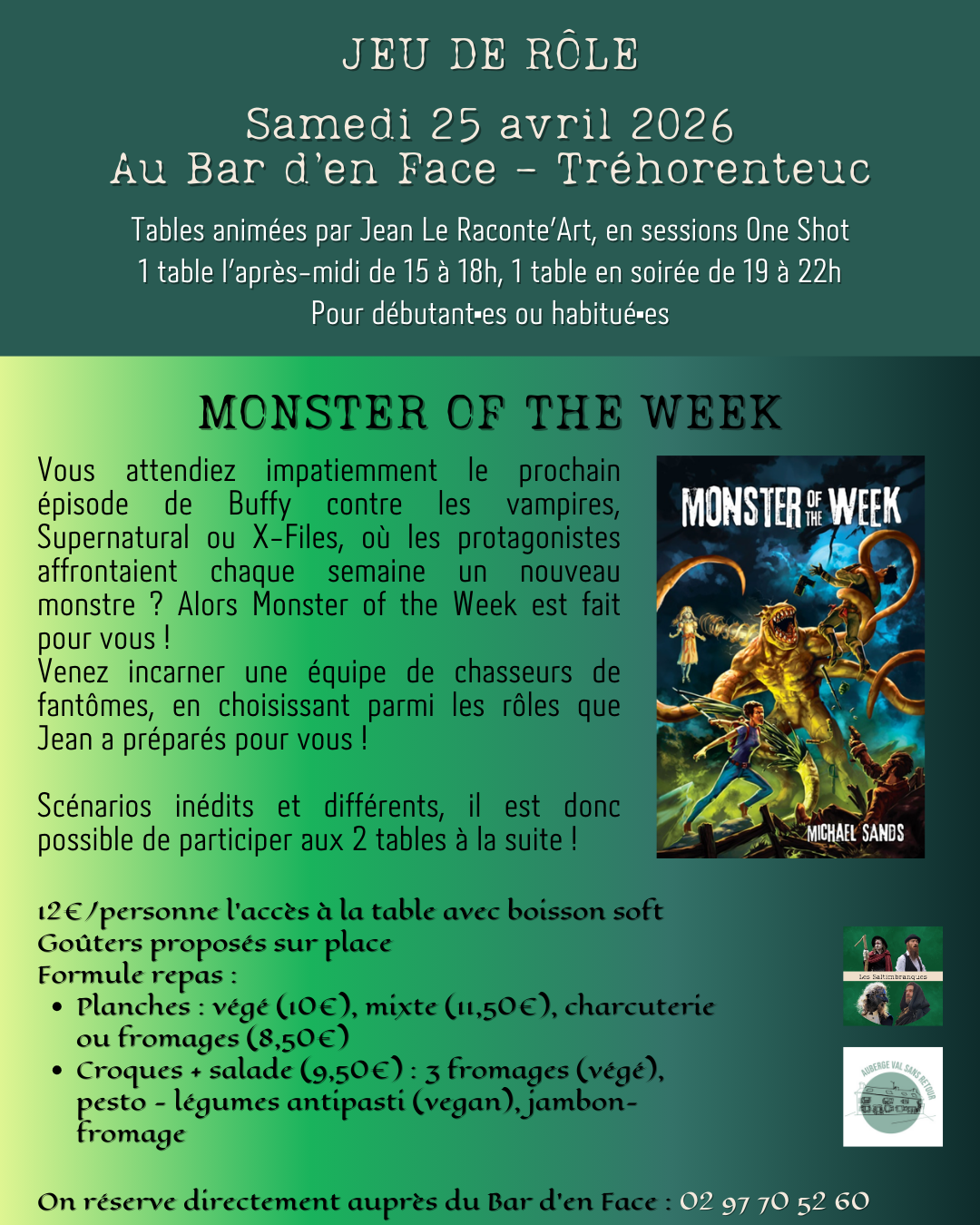 Cette année, les sessions de Monster of The Week reprennent du service, avec plein de scénarios inédits ! À retrouver Au bar d'en face, 1 fois par mois, désormais le samedi pour vous laisser le temps de rentrer et vous reposer avant la reprise du travail, ou pour profiter et prendre une chambre à l'Auberge Val sans retour, pour un week-end aux petits oignons !